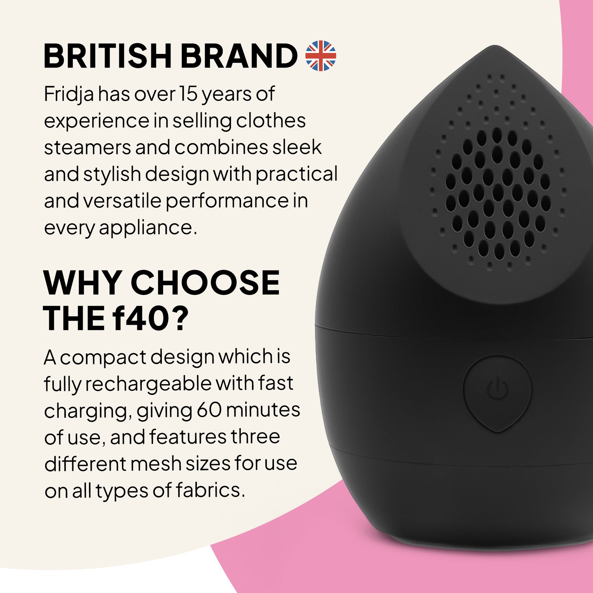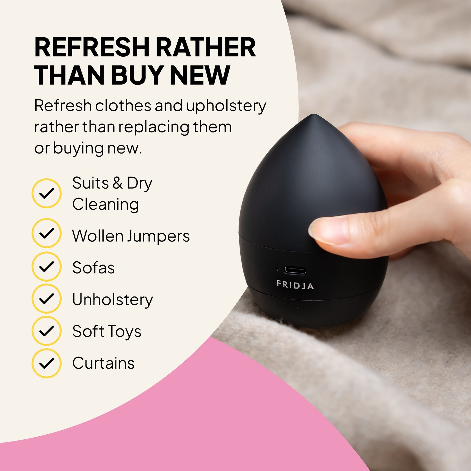 The Fridja f40 Fabric Shaver brings new life to old favourites. It gently removes bobbles and surface fuzz from knitwear, coats and upholstery, leaving fabrics smoother, cleaner and more refined.